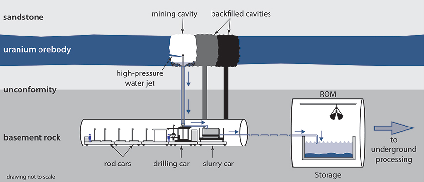 After many years of test mining, we selected jet boring, a non-entry mining method, which we have developed and adapted specifically for this deposit. This method involves: